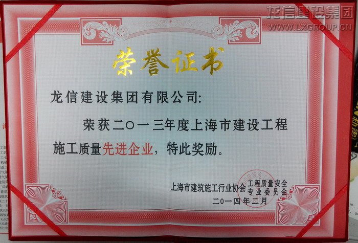 2013施工質量先進企業榮譽證書